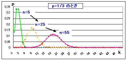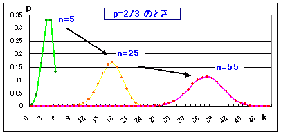 | 【なぜ二項というか?】 この確率分布関数 nCk pkqn-k が二項の和のn乗 (p + q)n の展開式となっているからである. |