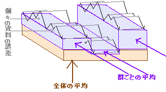 ◇一元配置法のイメージ◇ 資料の値の変動は,右図のように群(グループ,列,級)間の変動と個々の資料の群内変動(誤差による変動)に分けられる.すなわち,個々の値:yij ,列平均: yij - そこで, (この場合,通常のF値の扱いと異なり,大きい方を分子にするのでなく,必ず群間の不偏分散を分子とする.右図参照) |