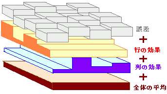 に分けて考える.ここで, (列の効果)=(列の平均)-(全体の平均) (行の効果)=(行の平均)-(全体の平均) (交互作用の効果)=(小ブロックの平均)-(全体平均)-(列の効果)-(行の効果) (誤差)=(個々の値)-(全体の平均)-(列の効果)-(行の効果)-(交互作用の効果) で定義する. 次に, 行の分散比=行の不偏分散/誤差の不偏分散 列の分散比=列の不偏分散/誤差の不偏分散 交互作用の分散比=交互作用の不偏分散/誤差の不偏分散 により,行,列,交互作用の平均値に有意差があるかどうか判断する. |
