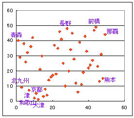 ※ 相関係数は0.20となり,相関はほとんど見られないが,魚が多いと肉が少ないのでなく,弱い正の相関となる・・・肉も魚もよく食べる都市,肉も魚もあまり食べない都市がある.(右の散布図参照・・・順位相関を散布図にするとき,左と下が数値が小=順位が上位になるので注意)