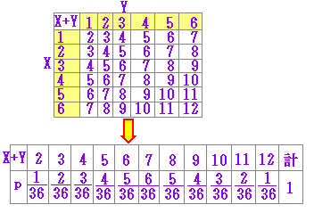 【 簡単な例 】 【例1】 2つの変数の組合わせごとに確率を考える(同時確率分布,結合確率分布)よりも,変数ごとに分けて考える方が簡単になる. 2個のさいころを同時に投げたとき出る目の和の期待値,分散を求めたいとき 計算1のように直接求めれば, ![]() のような複雑な計算になるが, 計算2から ![]() を組み合わせると ![]() のように,より簡単な計算で求まる. |