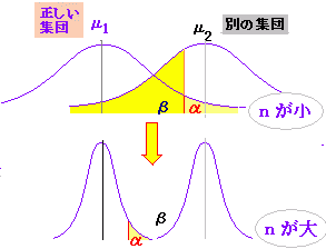 常識的に考えれば,危険率は小さい方が望ましいが第1種の過誤を小さくとり過ぎると,帰無仮説の採択域が大きくなり「間違っているものも正しものに入れてしまう過誤」:第2種の過誤を犯す確率(β)が大きくなる.βは標本の大きさ n を大きくとることにより低く押さえることができる.