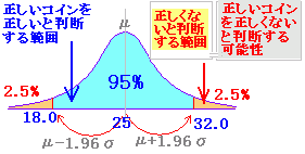 95%もの範囲に入らない理由としては,「コインが正しくない」場合と,「コインは正しいがめったにないことが起こった」場合の2つが考えられるが,「宝くじが当たるようなことを前提とした」判断をせずに,「コインが正しくない」方を選ぶ.(社会の安全,会社の信用などがかかっていたらどうだろうか・・・)