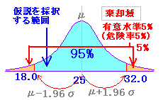 危険率1%の場合は,仮説が採択される範囲が99%となるので,正規分布で両側が棄却域の場合 X<μ-2.58σおよびX>μ+2.58σが棄却域となる.