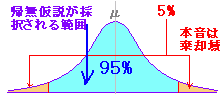 元の仮説の採択される範囲が95%,棄却される範囲が5%という基準は,元の仮説に対して非常にゆるく,対立仮説に対して厳しいものとなっている