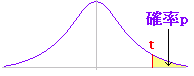(1) よく使われる確率に絞って,自由度-確率に対応するtの値が求められるようになっている. (2) t分布のグラフは左右対称となっている. (3) 片側検定に用いるには,2倍のpの値に対応するtを求めればよい. ![]() ※ t分布の表として,上記のようにA「pを両すその面積で表示するもの」の他,B「pを片側の面積で表示するもの」,C「-∞からの累積(1-Bの面積)」などがある.何を表わした表か確認してから使うことが重要. 例 n=5(自由度n-1=4)のとき,両すその和が0.05(5%)となるtの値は2.776 |