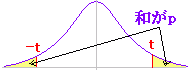 (解答)標本の大きさ(個数)が12<30なのでt分布を用いる. t分布で自由度11,p=0.05となるtの値は2.201 -2.201≦(45.8 - μ)/0.3014≦2.201より 45.13≦μ≦46.46 |