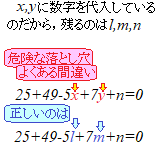 @が点A(−5, 7)を通るから25+49−5l+7m+n=0 −5l+7m=−74−n・・・(1) 同様にして,@が点B(1,−1)を通るから 1+1+l−m+n=0 l−m=−2−n・・・(2) 同様にして,@が点C(2, 6)を通るから 4+36+2l+6m+n=0 2l+6m=−40−n・・・(3) 連立方程式(1)(2)(3)を解いて,定数l, m, nを求める. まず,(1)−(2), (2)−(3)により,nを消去して,2変数l, mにする. l−m=−2−n・・・(2) 2l+6m=−40−n・・・(3) (1)−(2), (2)−(3) −l−7m=38・・・(5) (4)−(5)×6 50m=−300 m=−6 これを(5)に戻すと −l+42=38 −l=−4 l=4 これらを(2)に戻すと 4+6=−2−n n=−12 結局 x2+y2+4x−6y−12=0・・・(答) また,この式を円の方程式の標準形に直すと (x+2)2+(y−3)2=25 と書けるから,中心(−2, 3),半径5の円・・・(答) |