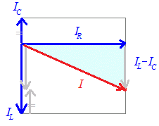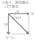 IRを基準方向として右向きに描き,IL −ICを下向きに描くと,次の図の水色の直角三角形の斜辺の長さが電流Iの大きさを表すことになる.