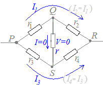 r1:r2=r3:r4のとき,まず図1の赤で示した部分がつながっていない状態で考えると,上の(1)のようにPQ,PS間の電圧降下が等しいからV=0, I=0 よって,赤で示した部分をつないでも電流は流れない. |