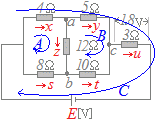 右図のように電流x,y,z,s,t,u及び電圧Eを未知数として,未知数7個,方程式7個の連立方程式を立てて解くこともできるが,このように一般的に解くと大変な作業になる.≪大変な作業の例≫ 分岐点a,b,cについて,各々キルヒホフの第1法則を適用すると x=y+z…(1) z+s=t…(2) y+t=u…(3) 閉回路A,B,Cについて,各々キルヒホフの第2法則を適用すると 4x+12z−8s=0…(4) 5y−10t−12z=0…(5) 4x+5y+3u=E…(6) 3[Ω]の抵抗の端子間電圧が1.8[V]だから u=0.6…(7) →右に続く