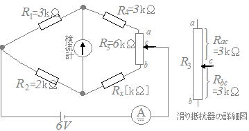 図のブリッジ回路を用いて,未知抵抗Rxを測定したい。抵抗R1=3[kΩ],R2=2[kΩ],R4=3[kΩ]とし,R3=6[kΩ]の滑り抵抗器の接触子の接点Cをちょうど中央に調整したとき(Rac=Rbc=3[kΩ])ブリッジが平衡したという。次の(a)及び(b)に答えよ。 ただし,直流電圧源は6[V]とし,電流計の内部抵抗は無視できるものとする。