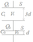 (別解)右図のように,2つのコンデンサが直列に接続されているのと同じだから C1=ε …(1) C0=ε …(2) Q=C1V1=C0V0…(3) (1)(2)を(3)に代入 ε V1=ε V0 → V1=3V0…(4) ここで V1+V0=120…(5) だから 4V0=120 → V0=30 |