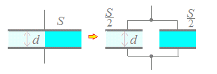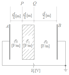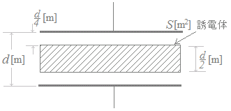誘電体を挿入してから後では,厚さ[m]の空気,厚さ[m],比誘電率2の誘電体,厚さ[m]の空気からなるコンデンサが直列に接続されているのと同じことになる.