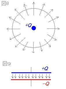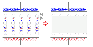 (解説)誘電率εの誘電体において,+Q[C]の電荷からは 本の電気力線が出ている. 面積がS[m2]の平行板コンデンサの陽極と陰極にそれぞれ+Q[C],−Q[C]の電荷があるときは,電界の強さは E= になる. ○ クーロンの法則によれば,誘電率εの誘電体中において+Q[C]の電荷から,距離r[m]離れた点における電界の強さは E= ところで,半径r[m]の球の表面積は4πr2であるから,上のことは+Q[C]の電荷から全部で ×4πr2=本の電気力線が出ていて これを4πr2[m2]の面積で分けたときに,「単位面積当たりの電気力線の本数」(=電界の強さ)が E= となることを示している. 図9のように,面積がS[m2]の平行板コンデンサの陽極と陰極にそれぞれ+Q[C],−Q[C]の電荷があるときは,この平行板コンデンサの極板間における電界の強さは E= になる. ○ 一般に,金属とは異なり誘電体の中には自由電子はないので電気は流れないが,図10のように+−が相殺される部分(灰色の部分)を除けば,全体として外部の静電気を弱めるような分極が起る. そのため誘電率εが大きいほど電界は弱くなる. 真空の誘電率ε0,比誘電率εrを用いると ε=ε0εr と書けるから,電界の強さは比誘電率に反比例する. |