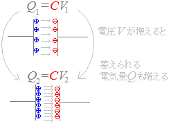 図1のように,加える電圧を増加すると,蓄えられた電気量は増加する.