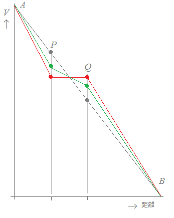 ![]() V=Ed が成り立つ(上図において傾き[の絶対値]は電界の強さ) ○ C0の場合は,図の黒線で示したようにA-P間,P-Q間の電位差が等しくなる. VAP=VPQ=Ed ○ これに対して,C1の場合,直列接続のコンデンサの各電気量Q’が等しい(C0と比較すると全体の静電容量が変化するので,このQ’は上記のQとは等しくない)のに対して, E= により,電界の強さは誘電率εに反比例する(したがって,比誘電率εrに反比例する:ε=ε0εr)から, VAP=EAPd=d VPQ=EPQd=d において,εr>1だから,A-P間の電位差よりも,P-Q間の電位差が小さくなる.(図の緑線) ○ さらに,C2の場合には,P-Q間の電位差は0になる.(図の赤線) 以上から,Pの電位,緑●は黒●よりも低い:(1)は真 Qの電位,緑●は黒●よりも高い:(2)は真 Pの電位,赤●は黒●よりも低い:(4)は偽 →【答】(4)