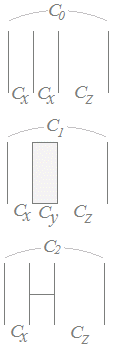 (3)(5):静電容量について固体誘電体を挿入したときのA-P間,P-Q間,Q-B間の静電容量を各々Cx,Cy,Czとおくと, C0は右図のようにCx,Cx,Czが直列に接続されているのと同じになるから =++ C1は右図のようにCx,Cy,Czが直列に接続されているのと同じになるから =++ C2は右図のようにCx,Czが直列に接続されているのと同じになるから =+0+ ここで,極板間を誘電率ε(比誘電率εr (εr>1))の誘電体で満たしたときは C=ε =ε0εr の公式により Cy=ε0εr >ε0 =Cx よって 0<< したがって << C0<C1<C2 →(3)(5)はいずれも真 |