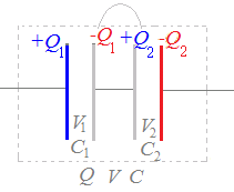 により Q1:Q2=C1:C2 となって電気量の比は静電容量の比に等しい.(3個以上でも成り立つ) |