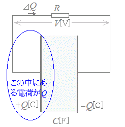 ○ 両極板の電荷が各々+Q[C],−Q[C]に帯電しているときに消費されるエネルギーは