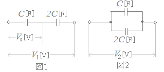 また,図1においてコンデンサ2Cに加わる電圧をV2cとすると,Vc:V2c=2C:C=2:1(静電容量の逆の比)だから
