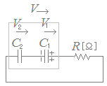 右図のようにコンデンサが直列接続されているものと見なし,各々のコンデンサにかかる電圧をV1, V2とする.ただし,上の解説とは異なりV1, V2の向きを右図のように決め,V=V1+V2が0になったら電流は流れなくなると考える.直列コンデンサの合成容量は