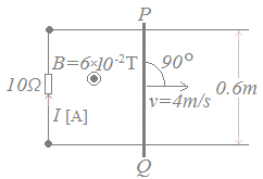 紙面に平行な水平面内において,0.6[m]の間隔で張られた2本の直線状の平行導線に10[Ω]の抵抗が接続されている。この平行導線に垂直に,図に示すように,直線状の導体棒PQを渡し,紙面の裏側から表側に向かって磁束密度B=6×10−2[T]の一様な磁界をかける。ここで,導体棒PQを磁界と導体棒に共に垂直な矢印の方向に一体の速さv=4[m/s]で平行導線上を移動させているときに,10[Ω]の抵抗に流れる電流I[A]の値として,正しいのは次のうちどれか。 ただし,電流の向きは図に示す矢印の向きを正とする。また,導線及び導体棒PQの抵抗,並びに導線と導体棒との接触抵抗は無視できるものとする。 ![]() (4)0.0144 (5)0.0288 HELP