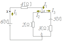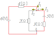 たとえば,点aにおいて入って来る電流をI1,出て行く電流をI2,I3とおくと,キルヒホフの第1法則により I1=I2+I3…(1)