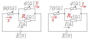 左下図のように未知数が電流x,y,s,t,I,抵抗Rx,電源Eの合計7個ありますが,IはEに比例するため,I,Eは定まりません.