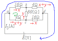 なるべく未知数の個数が少なくなるように,4[Ω]の抵抗に流れる電流は,キルヒホフの第1法則を使ってx+yと表しておく.