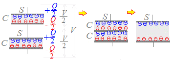 C=ε により静電容量Cが減少し, Q=CV → V=により,電圧が高くなる. (2) 図2の左下図において,コンデンサに電源からV[V]の電圧がかかった状態で,外力を加えて極板間距離を広げると C=ε により静電容量Cが減少し, Q=CVにより,電荷が減少する. 右図5のように,V[V]の電圧がかかっているところに2つのコンデンサを並列に接続すると,各電極板の電荷は正負の符号のみ異なり大きさは同じになるが,電圧が2つに分けられてそれぞれ半分ずつになるため C=となるのも同様の事情による. (3) 図2右下のように,コンデンサの極板間に誘電率(誘電率ε[比誘電率εr>1])の絶縁体を入れると C=ε0 → C’=ε =ε0εr となって,静電容量が増える. もし,コンデンサにQ[C]の電荷が蓄えられた状態(一方の極板には+Q[C]の,他方の極板には−Q[C]の電荷がある)で回路から切り離されているとき,これらの電荷は変化しないから,誘電率ε[比誘電率εr>1])の絶縁体を入れると, C=ε により静電容量Cが増加し, Q=CV → V=により,電圧が下がる. もし,コンデンサに電源からV[V]の電圧がかかった状態で,誘電率ε[比誘電率εr>1])の絶縁体を入れると, C=ε により静電容量Cが増加し, Q=CVにより, 電荷が増える. もし,図6のように半分を空気(誘電率はεr:真空と同じ)で半分を誘電率ε(比誘電率εr>1)の絶縁体で埋めると,それぞれ面積が半分のコンデンサを並列に接続したものと同じになり C’=ε0 +ε0εr =ε0 =C になる. |