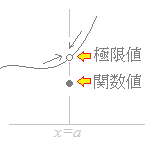 右図の○で示した極限値f(x)は,正確にはxが aでない値をとりながらaに限りなく近づくときの目標値を表しており,aの周辺での関数のグラフの様子に対応しています.この極限値は,関数値f(a)とは無関係に定義されるところが重要です. 右図の●で示した関数値f(a)は,xにaを代入したときの値です. これらの,○と●が一致するときに,x=aにおいてグラフが「つながる」ことになり,「連続」であるといいます.