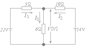 (1)からI1=I3−I2…(1’)(1’)を(2)に代入してI1を消去する 5(I3−I2)+6I3=21