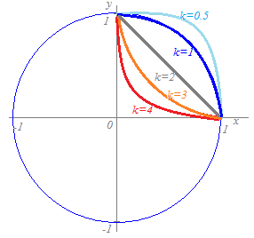 k=2→x+y=1のとき直線(一部:線分) でkの大小に応じて図のように曲がり方が変わります. ![]()