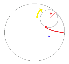 大きな円(半径a)の外側に小さな円(半径b)を滑ることなく転がしていくときに,小さな円の周上にある点Pの軌跡はエピ・サイクロイドと呼ばれます. ![]()