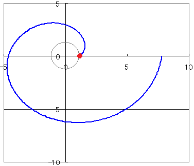 【参考:図形的な意味】 図のように,円周に巻きつけられた糸の糸口Pが円周上の1点Aに重なっているときに,この糸をたるまないように引っ張りながらほどいていくときの点Pの軌跡を考える. ![]() PQは接線だからPQ⊥OQ→∠PQN=∠QON=t このとき,Pのx座標は