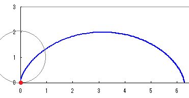 【参考:図形的な意味】 図のように円をx軸に沿って「滑らないように」回転させる.はじめ原点と重なっていた円周上の1点Pの描く軌跡を考える. ![]() Pのx座標は
