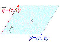 (解説)次の図のような2つのベクトル=(a, b), =(c, d)で作られる平行四辺形の面積Sは S=|ad−bc| で求められます. ![]() Sは の絶対値となります.S=||||sinθ …(1) において,ベクトルの内積と角度の関係式 · =ac+bd=||||cosθ …(2) から,cosθを求めて sinθ= (>0) …(3) に代入すると(途中経過省略) S= = =|ad−bc| となることを示すことができます.