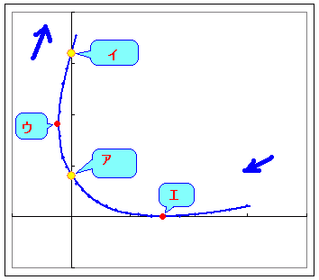 x=t2-6t+8で表されるグラフの概形(およその形)を描いたものです。 この図において,次の各点の座標を求めなさい。 y軸との交点 ア (,)x軸との接点(かつ,y方向の増減が変化する点) エ (,)x方向の増減が変化する点 ウ (,) |