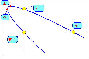 x=t2-4で表されるグラフの概形(およその形)を描いたものです。 この図において,次の各点の座標を求めなさい。 y軸との交点 ア (,)x軸との交点 イ (,)x方向の増減が変化する点 ウ (,)y方向の増減が変化する点 エ (,) |