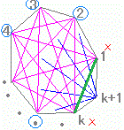 [青い線で示した]第k+1番目の頂点と2からk−1番目までの頂点を結んだk−2本と,[緑の線で示した]1とk番目を結ぶ,元は辺だったが新たに対角線になるものの合計1+(k−2)=k−1本