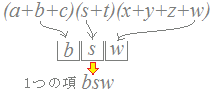 解説展開とは「代表選手の選び方」だと考えるとよくわかります. 例えば,次の図のように左の( )から1つの項bを,中央の( )から1つの項sを,右の( )から1つの項wを選んで組み合わせるとbswができます.1つの( )からは「代表選手は1つだけ」えらぶことができ,abなどという項はできません. ![]() 積の法則により,3つの( )から代表選手を選ぶ方法は3×2×4=24通り |