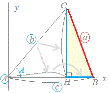 b, c , Aが与えられているとき、直角三角形AHCの3辺の長さが求まるので、HB , HCの値から三平方の定理を使って