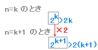 (I) n=3 のとき, 左辺=23=8 右辺=6 よって,n=3のとき(A)が成り立つ. (II) n=k ( k≧3 )のとき(A)が成立すると仮定すれば,