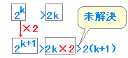 ⇒ n=k のときも,n=k+1 のときも代入しているだけで何も証明されていない.n=k+1 のときも代入してしまうと,その式が n=k+1 のときに成立することを仮定していることになる.⇒ n=k のときは成立することを仮定しなければならないが,n=k+1 のときは成立することを証明しなければならない. (*3) k≧5 という条件を使わなければ (k−1)2−2>0 は示せない. この範囲外,たとえば k=1 のときは (k−1)2−2=−2<0 となり,証明はできない. |