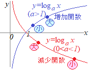 (1) 右図のように,底a>1のとき,増加関数になるので対数logap, logaqの大小は,真数p, qの大小と一致します.