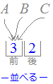 2個並べる順列にするときは,2個の要素からなる1つの組合せ×2!の並べ方があるので組合せ{A, C} ←→ 順列ACとCAが対応する 組合せ{B, C} ←→ 順列BCとCBが対応する 3P2=3C2×2! つまり で求められることになります. 「異なる5個のくだものから,異なる3個のくだものを選ぶ(選ぶだけで並べない)組合せ」は,次のように,順列から逆算すると分かります. から3個とって並べる方法