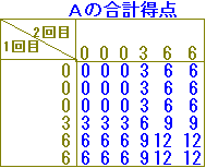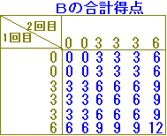 Bが2回取り出したときの合計得点は,次の表のようになります.上の(1)の表とこの表を組合せると,Aの合計得点とBの合計得点がともに6点となる確率が求まります. ![]() |