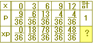 上の表により,Aの合計得点x=0,3,6,9,12となる確率p及びxpは,各々次の表のようになります. ![]() |