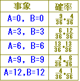 AとBの合計得点が等しくなる場合を,各々乗法定理で求めて,集計します. ![]() |